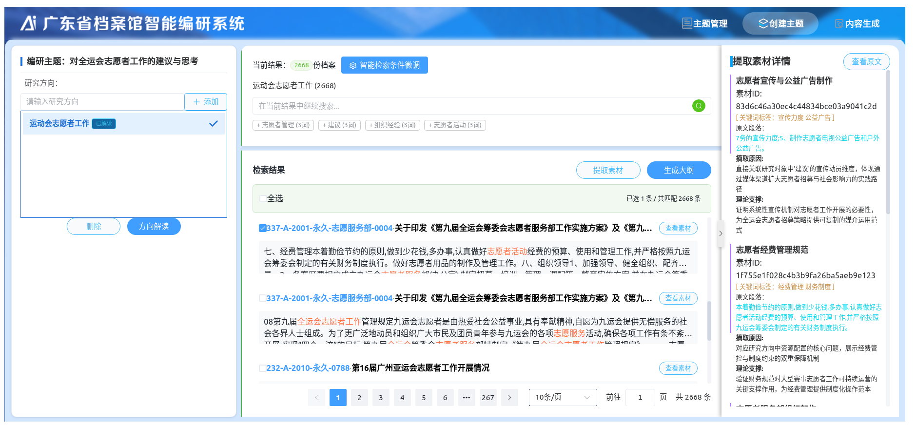 “档案不仅要存得好,更要用得活。”广东省档案馆相关负责人表示,依托数字档案馆建设成果,馆内打造“智能编研”服务体系,将人工智能、语义分析、知识图谱等前沿技术深度嵌入编研全流程,构建起智能检索、要素提取、大纲生成、成果编辑的全链条工作机制,大幅提升了资政服务效率和精度。针对十五运会筹备等省级重大工作,工作人员依托数字档案馆系统深入挖掘馆藏六运会、九运会等相关档案,通过大语言模型智能辅助构建资政编研大纲,快速形成专题研究成果,为赛事筹备提供宝贵的经验借鉴与决策参考。
